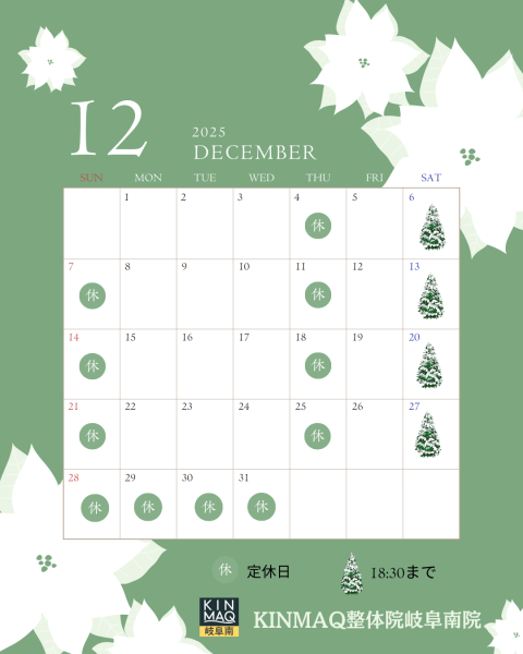 【2025年12月】営業日のお知らせ KINMAQ整体院岐阜南院です🎄 12月の営業日での祝日はありませんので、通常通り営業となっております。 年末年始は12/28~1/4まで休業日になります。 ご迷惑をお掛けしますがよろしくお願いいたします。 ご予約が大変埋まりやすくなっている為、ご予約の際はお早めにお問い合わせください。 今月もよろしくお願いいたします。 【営業時間】 月・火・水・金曜 : 10:00~20:00 土・祝日 : 10:00~18:30 KINMAQ(キンマク)整体院 岐阜南院 058-213-0933